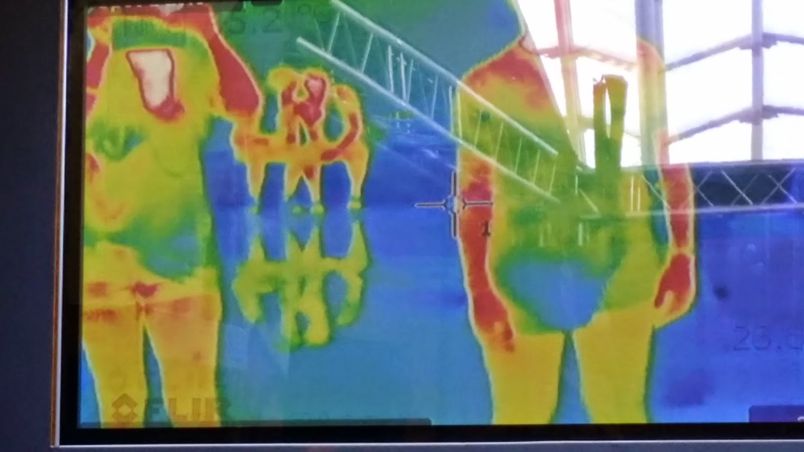 Ca sa fie inteleasa mai bine aceasta termografie, va arat poza mea facuta cu aceeasi tehnologie la Muzeul Stiintei din Valencia. Portiunile cu rosu sunt cele cu temperatura cea mai mare si la cealalta extrema sunt cele cu albatru.