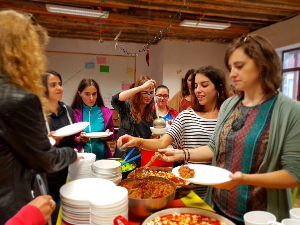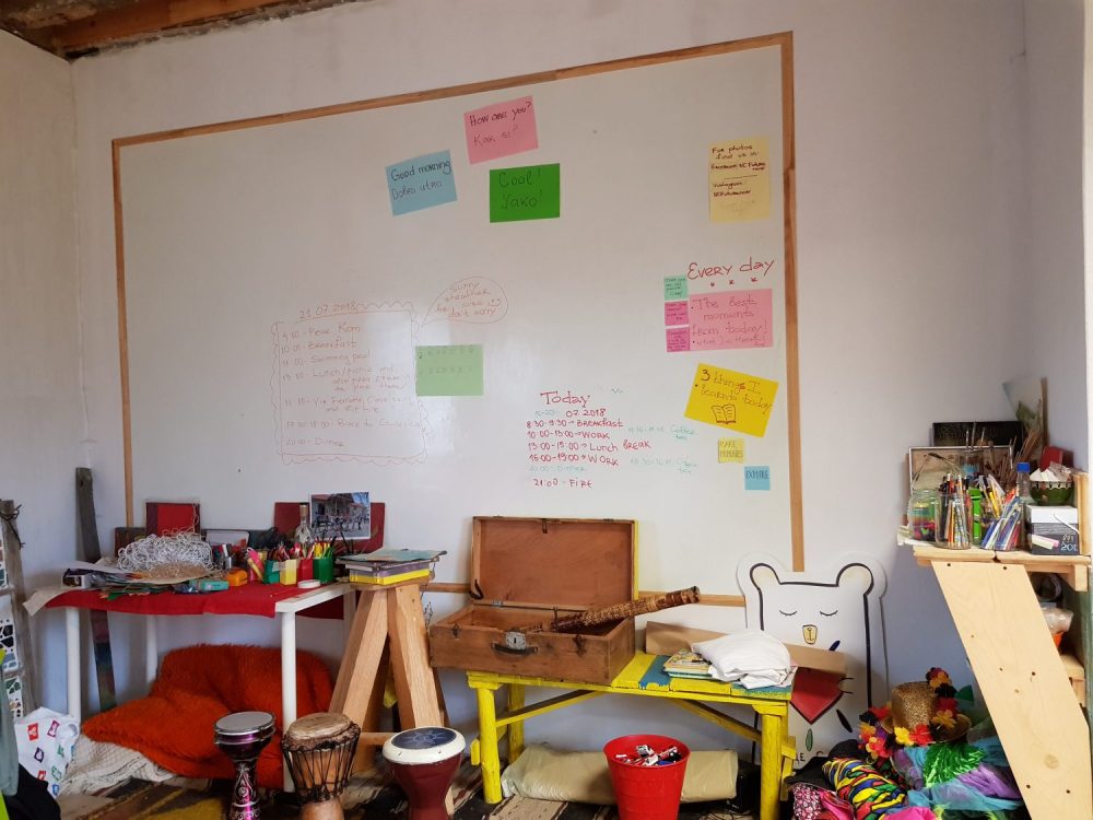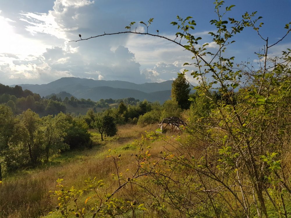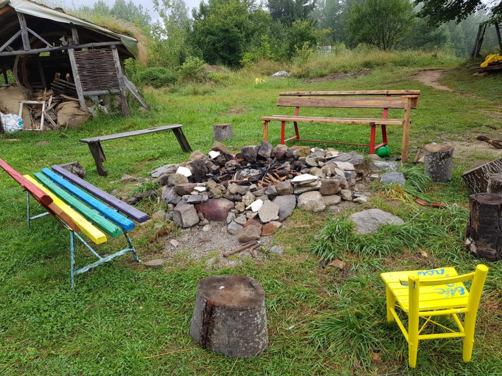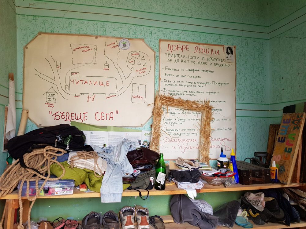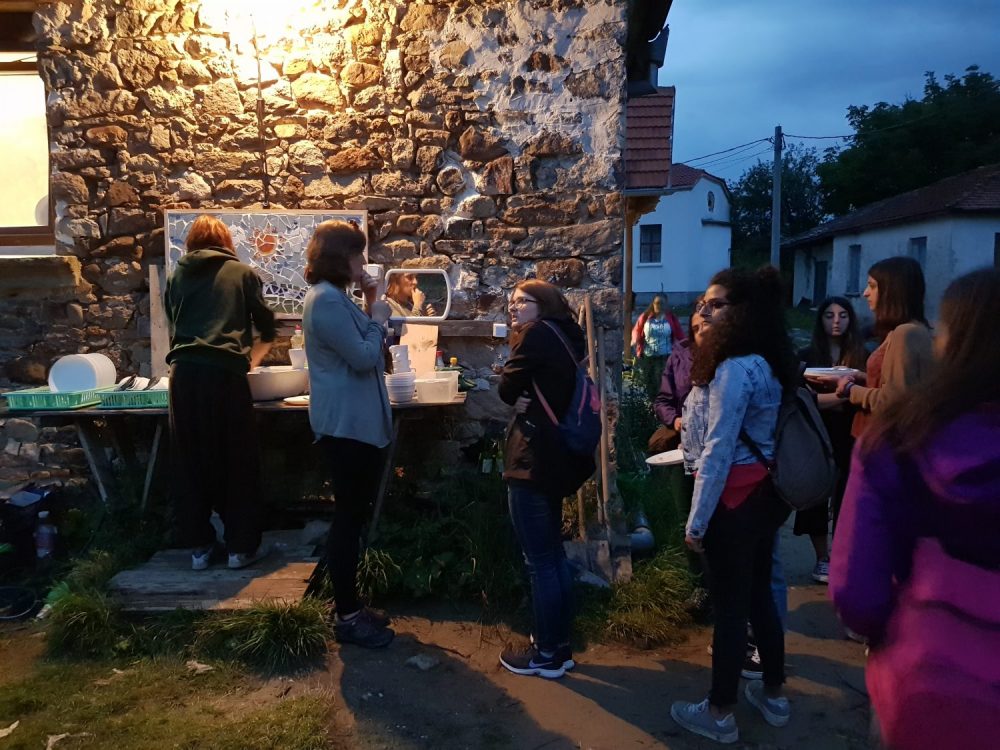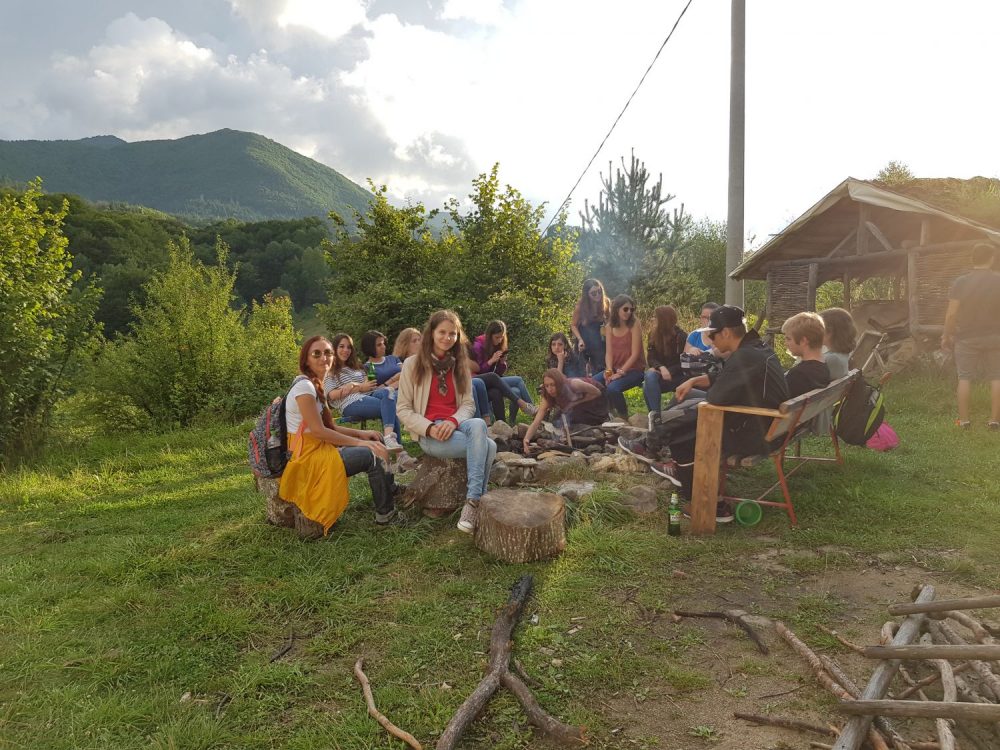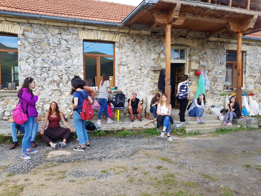 Surpriza a venit abia sus, pana sa ajungem pe platou ne-au intampinat glasuri tinere, voioase. Se muncea la reconstructia vechii scoli cu ajutorul voluntarilor. Cativa tineri ajutau la constructia unei terase, iar altii tencuiau cu argila peretii interiori. Eram mult prea absorbita de peisajul inconjurator, de culesul de mure, zmeura, afine si n-am socializat atunci deloc, dar in timpul mesei de seara am facut cunostiinta si am aflat ca erau voluntari veniti tocmai din Belgia, prin Bouworde vzw . Apoi grupul meu a facut un foc de tabara si am inceput sa depanam povesti pana cand a inceput ploaia. Atunci unii au hotarat sa se intoarca la Smolyan, iar altii sa ramana aici ca sa-si petreaca noaptea. Eu am ramas si impreuna cu belgienii ne-am asezat comod, in cerc, pe niste perne si am inceput sa vorbim verzi si uscate, daruindu-ne unii altora din entuziasmul petrecerii unei zile in aer liber ce ne-a incarcat cu energie pozitiva. In total eram 18 persoane de 8 nationalitati. La venirea noptii ne-am tras fiecare cate o saltea si in aceeasi camera in care mancasem si apoi discutasem, am adormit.