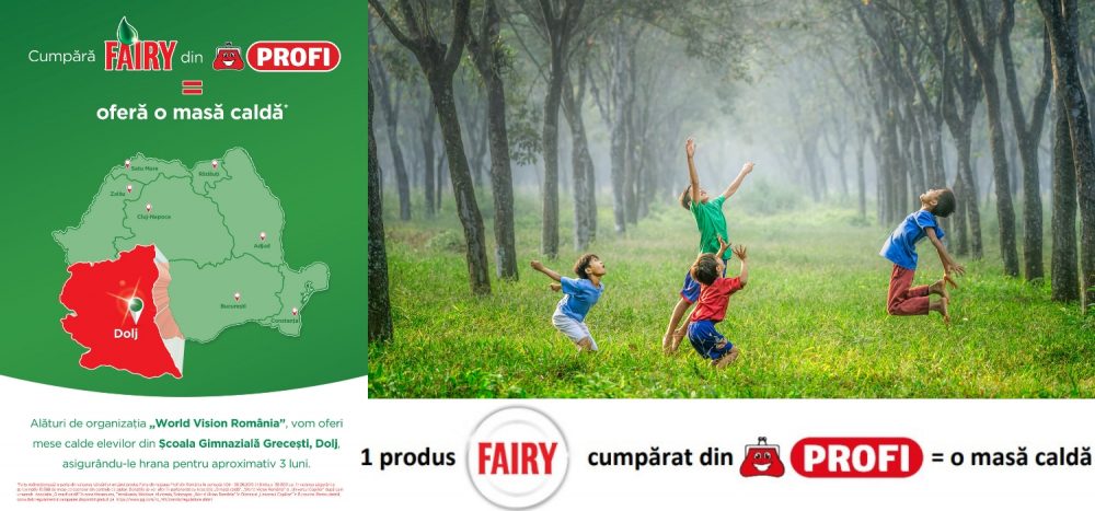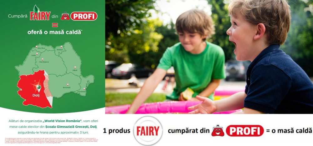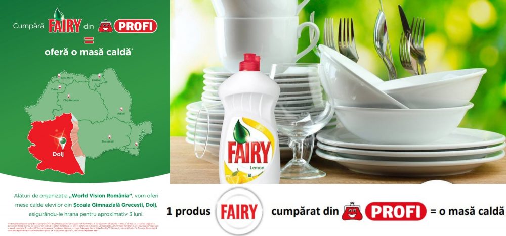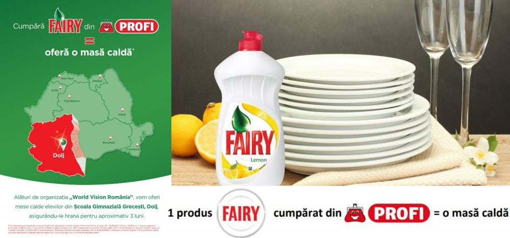 Muncim din greu pentru a asigura familiei noastre un trai decent. Banii sunt putini si mereu nu ajung pentru tot ce ne-am dori. A rupe din ei pentru cei defavorizati de soarta ne este cateodata peste mana, asa ca Fairy Romania propune altceva. Prin campania „Fairy donează mese calde persoanelor aflate în situații vulnerabile”, tu ai astazi oportunitatea de a ajuta fara ca aceasta contributie sa fie dureroasa. Priveste prin prisma Fairy, prin prisma campaniei. Pentru fiecare produs Fairy vandut in magazinele Profi, Fairy va face donatii catre Asociatia „O masă caldă”, Fundatia „Emanuel” si Organizatia World Vision România, pentru a oferi mese calde persoanelor aflate in situatii vulnerabile din toate zonele din tara: Maramures, Bucovina, Banat – Crisana, Transilvania, Moldova, Oltenia, Muntenia si Dobrogea. Beneficiarii din zona Olteniei vor fi elevii din Scoala Gimnaziala Grecesti, Dolj. Fairy le va asigura o masa calda pentru aproximativ 3 luni. Zona este putin favorabila din punct de vedere economic, agricultura este principala indeletnicire si pamantul este fertil. Veniturile obtinute sunt modeste si din pacate adesea se intampla ca ploile torentiale sau topirea zapezii sa duca la alunecari de teren care produc pagube insemnate in gospodarii.