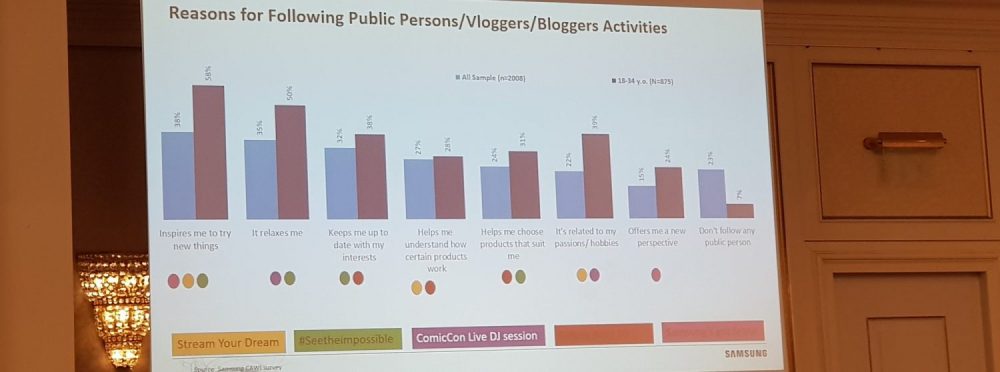 In mare Ioana a vorbit si anul acesta despre aceeasi strategie de influencer marketing, modul cum Samsung se conecteaza cu comunitatea prin influenceri. Conform studiilor lor influencerii au avut cel mai mare impact in comunitate. De ce? Nu mai vrem reclame avem adblockere, dar vrem povesti bine spuse. Influencerii sunt credibili, au relatii de loialitate cu fanii si daca sunt si aliniati cu brandul respectiv se poate valorifica foarte bine comunitatea acestora. Ca obiective de brand: reputatia, increderea, deviceuri foarte bune cu care se poate genera continut, un pull de oameni loiali brandului cu care sa se obtina colaborari autentice care sa sustina sentimentul de atasament timp indelungat astfel incat sa fie o relatie win-win de care ambele parti sa fie mandre.